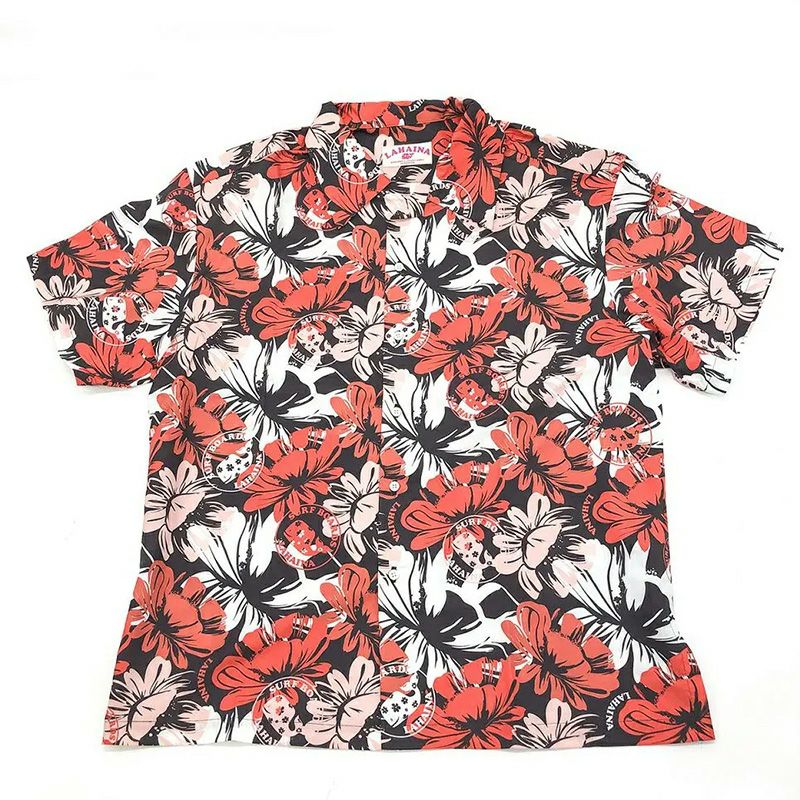レッドを基調とした定番のハイビスカス柄をプリントしたアロハシャツ。夏の定番アイテムであるアロハシャツはヘビーローテーション間違いナシ。ポリエステル素材で吸湿性が低く乾きやすいので夏にはありがたい一着。アロハの中に隠れてる花クジラとハイビスカスがかわいい♪