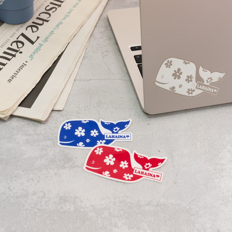 LAHAINAのアイコン、花クジラのオリジナルステッカー。スマートフォンやタブレットに、ちょうどよいサイズです。