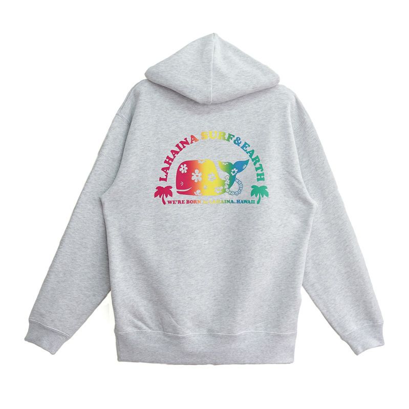 【LAHAINA 花クジラ】花クジラプリントが映える、裏起毛のふんわりレインボープルパーカー LAHAINA 半円花クジラレインボープルパーカー(裏起毛)