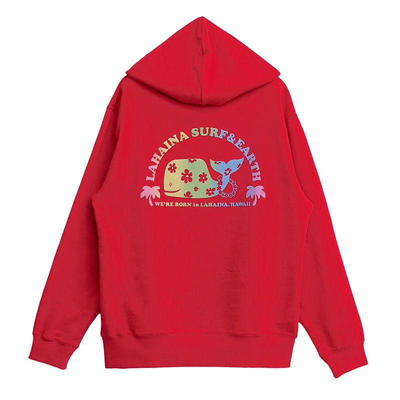 【LAHAINA 花クジラ】ゆったり着られるベーシックなシルエットに、丈夫な二重フードとカンガルーポケット付き LAHAINA 半円花クジラグラデーションプルパーカー