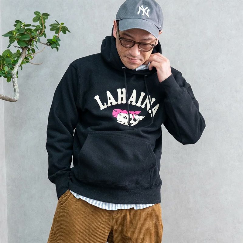 4. LAHAINA ロゴ花クジラフロントプリント裏起毛プルパーカー