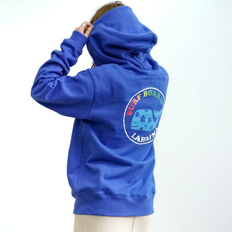 【LAHAINA 花クジラ】ゆったり着られるベーシックなシルエットに、丈夫な二重フードとカンガルーポケット付き LAHAINA 半円花クジラグラデーションプルパーカー